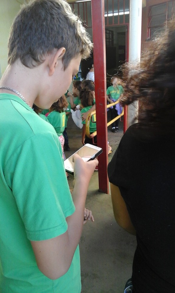 Realizamos mais uma etapa do projeto de Matemática com Tecnologias, com a parceria PROGETEC, professora Rosa Arlene Machado e o 9Ano. Nesta aula utilizamos os celulares com o aplicativo QR Droid, disponivel para Android, que a professora ja havia ensinado a manusear e previamente instalado nos aparelhos dos alunos. A professora fez uma aula de Caça ao tesouro, onde os alunos tinham que descodificar as pistas em QR até encontrar as respostas, também em QR, escondidas na escola.